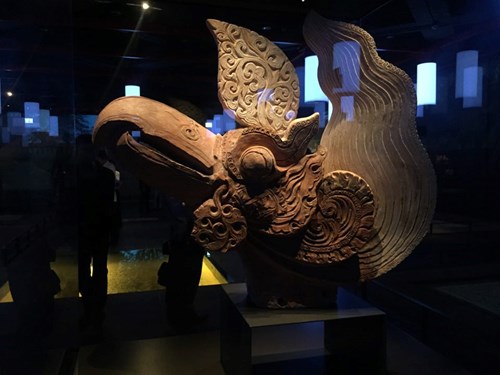 Mais le musée présente aussi deux mosaïques contemporaines constituées de morceaux de briques et de tuiles brisées que les archéologues ont trouvés sur place. Ces mosaïques ont été créées par une certaine Bui Thu Trang. L’une s’appelle «Le dragon s’envole», faisant référence au dragon du rêve du roi Ly Cong Uan, celui-là même qui l’a incité à transférer la capitale de Hoa Lu à Thang Long, mais aussi au motif du dragon qui est omniprésent dans l’architecture des Ly. La deuxième mosaïque s’appelle «Thang Long à l’aube», valorisant le motif décoratif de la feuille du figuier des pagodes et les tuiles en forme de tube décorées de lotus qu’on trouve souvent sur le toit des palais des Ly.