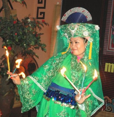 Les chamans peuvent être des hommes ou des femmes, indifféremment. Mais chaque fois qu’ils assument ce rôle, ils se maquillent minutieusement. Même les hommes ont un visage maquillé avec de la poudre, du fard à joue et du rouge à lèvres. Leurs cheveux peuvent être aussi longs que ceux d’une femme. Dans chaque séance de possession d’esprits, ils sont possédés par plusieurs divinités. Ils doivent préparer des vêtements et adopter des gestes correspondant à ceux des divinités en question. Chaque fois qu’une divinité «investit» le corps d’un chaman, on met un foulard rouge sur sa tête, de même quand elle sort et qu’une autre lui succède. Chaque fois qu’on lève le foulard, le chaman est, aux yeux des fidèles, l’incarnation d’une nouvelle divinité. Il peut donc être tantôt un général, tantôt un mandarin majestueux, tantôt une fille dansante. Ses danses changent en fonction des caractéristiques du génie qu’il est censé représenter. Les chamans sont ceux qui ont été sélectionnés par les génies pour les connecter au monde des vivants. Le professeur Ngô Duc Thinh, directeur du centre de recherche et de préservation de la culture et des croyances vietnamiennes: