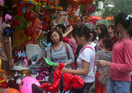 Le point le plus animé se situe entre les rues Hang Ma et Hang Thiec. On y vend toutes sortes de jouets, mais les plus éclatants sont sans doute les lanternes multicolores: celles étoilées, celles à ombres mobiles, celles prenant la forme d’un lapin… Les enfants sont évidemment les plus motivés, mais les adultes ne sont pas en reste. Et même si les jouets modernes sont légion, les jouets traditionnels comme les têtes de lions et les masques d’animaux attirent toujours les clients désireux de garder quelque chose du passé. C’est le cas de Vu Thi Thuy, qui vient de s’acheter une figurine en pâte de riz colorée: