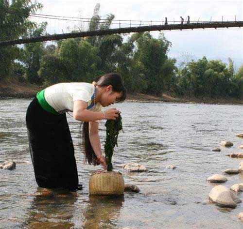 Pour les Thais noirs dans la province de Dien Bien, les mousses sont un plat uniquement réservé aux convives de marque. On a donc des mousses grillées ou frites. Mais il faut reconnaître que ce sont les mousses mêlées avec du gras et des ingrédients du terroir emballées dans des feuilles de phrynium qui sont les plus délicieuses. Et les plus originales aussi, puisqu’elles sont cuites dans des cendres brûlantes puis au charbon jusqu’à ce que les feuilles de phrynium soient complètement calcinées, que le gras et le liquide vert parfumé typique des mousses de ruisseaux suintent. C’est à ce moment là qu’on extrait les mousses des cendres pour les mettre sur un plateau. Quand vous ouvrez l’emballage de phrynium, vos papilles devront alors faire face à une offensive irrésistible d’un mélange de plusieurs dizaines d’ingrédients. Mais les mousses, elles, restent d’un goût frais et incroyablement fin! Aux dires des Thais, c’est un plat qui aide à la circulation sanguine, à se désintoxiquer, à se rafraîchir et à lutter contre l’hypertension artérielle. Seul bémol: les mousses ne sont disponibles qu’à une seule saison. Lò Thị Lường: “On peut trouver les mousses en hiver seulement. Et c’est entre octobre et décembre qu’elles sont les plus délicieuses. Le reste du temps, elles sont vieilles, jaunes, en un mot pas consommables. Pour pouvoir manger des mousses tout au long de l’année, il faut les consommer séchées, mais c’est décidément moins bon que lorsqu’elles sont fraiches.”