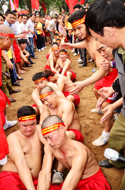 Le jour J, les trois équipes forment trois rangs dans la cour du temple Tran Vu. L’un des chefs d’équipe dépose des offrandes au temple. Après le culte au temple et la présentation des règles, les trois équipes font un tour du chemin sacré du village en courant puis se réunissent dans un terrain destiné au jeu. Un poteau y est planté, avec un trou percé à la hauteur du genou d’un adulte pour faire passer la corde. Les membres des équipes sont donc assis par terre, une jambe pliée, l’autre étendue, un bras étendu et l’autre plié devant la poitrine, la corde étant tenue sous l’aisselle de ce bras. Et le jeu commence par un mot d’ordre simple : « Tire ! ». Et quelle que soit l’évolution du jeu, c’est toujours l’équipe du hameau de Duong qui gagne. Pourquoi ? Le Van Cu, gardien du temple Tran Vu, explique :