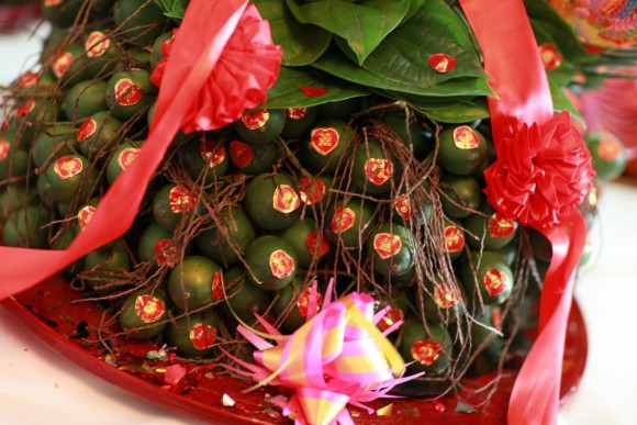 « Que l’on soit mâcheur ou non, tout le monde doit utiliser le plateau de cérémonie lorsqu’il s’agit d’une cérémonie de demande de la main, d’un mariage ou d’une cérémonie dans les pagodes. Le plateau est de forme carrée, avec deux boîtes de bétel et de noix d’arec de tailles différentes, la grande symbolisant le mari, et la petite, sa femme. Il y a aussi sur le plateau deux tasses d’alcool. Mais s’il s’agit de funérailles, il n’y a plus qu’une boîte et qu’une tasse, et le maître de céans est invité à chiquer du bétel et à boire de l’alcool. »