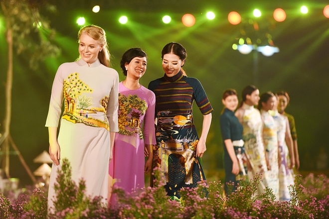 Des jeunes femmes charmantes, une rue de la céramique, un pavillon de la pléïade au Temple de la littérature, la tour aux tortues au lac de l’Epée restituée, des estampes populaires, des rues anciennes… Voilà quelques uns des motifs que les stylistes se sont amusés à utiliser pour leurs ao dai. Certains se sont même inspirés de peintures célèbres, voire d’affiches de propagande. Tout est bon pour valoriser cette tenue emblématique, synonyme de beauté et d’élégance des Vietnamiennes en général et des Hanoiennes en particulier, estime la styliste Minh Hanh:
