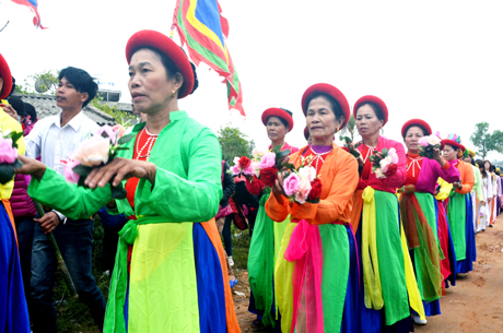 « C’est ma mère qui m’a appris à chanter. Au fur et à mesure, mon âme a été imprégnée de ce chant traditionnel », a dit Hoang Thi Thao, 80 ans, une chanteuse chevronnée. Elle est membre du club de chant du hameau de Nam, qui est rattaché à la commune de Van Ninh, l’un des berceaux du nhà tơ. Avec ses consoeurs Phung Thi Gai et Nguyen Thi Tu, elle fait partie de la troisième génération de ceux qui peuvent se targuer de connaître par coeur tout le répertoire traditionnel du nhà tơ, autant des chansons que des danses. Nguyen Thi Tu, 84 ans, a estimé : « Avant de chanter, il faut rendre hommage aux divinités. Et on se doit de chanter juste, la moindre erreur serait une offense à l’égard des divinités. Dans nos chants, nous formulons des vœux de prospérité, de longévité, de paix, et de fertilité. »