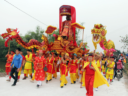 Direction Da Trach, une commune rattachée à la province septentrionale de Hung Yên. Ce nom est connu de tout Vietnamien qui se respecte. Il est en effet lié à la légende de Chu Dông Tu et de Tiên Dung, le premier étant paysan et la seconde, princesse. Leur histoire d’amour fait rêver depuis des générations, tant et si bien que la fête dédiée au couple mythique attire des foules, chaque année, du 10e au 12e jour du deuxième mois lunaire. La ferveur populaire est d’autant plus grande que Chu Dông Tu a été « canonisé » par la population pour avoir transformé un marécage en terre fertile, cultivable et habitable. La fête commence donc au matin du 10e jour du deuxième mois lunaire avec une procession qui part du temple de Da Trach et qui va jusqu’au bord du Fleuve rouge. Le cortège est conduit par une troupe de danse au dragon, suivie d’une chaise à porteurs où trône l’effigie du génie à côté d’un vase destiné à contenir l’eau qui sera prise dans le fleuve. Une deuxième chaise à porteurs transporte la statue en bois doré d’une carpe transformée en dragon qui traduit les aspirations à domestiquer la nature des pêcheurs locaux. La cérémonie de prise de l’eau s’effectue dans le cours du fleuve. Selon la croyance populaire, c’est là que l’eau est la plus pure. Cette eau sera ensuite présentée en offrande sur l’autel dédié au génie au temple de Da Trach, précise Nguyên Huu Bôn, un villageois.