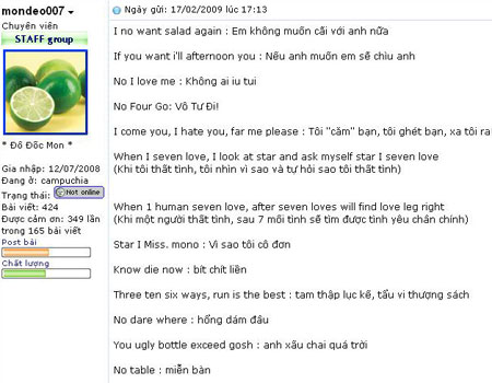 Plusieurs éléments du langage moderne se trouvent dans cette conversation: de l’argot, de l’anglais, du langage du net… résultat d’une assimilation créative des jeunes Vietnamiens, en matière linguistique.