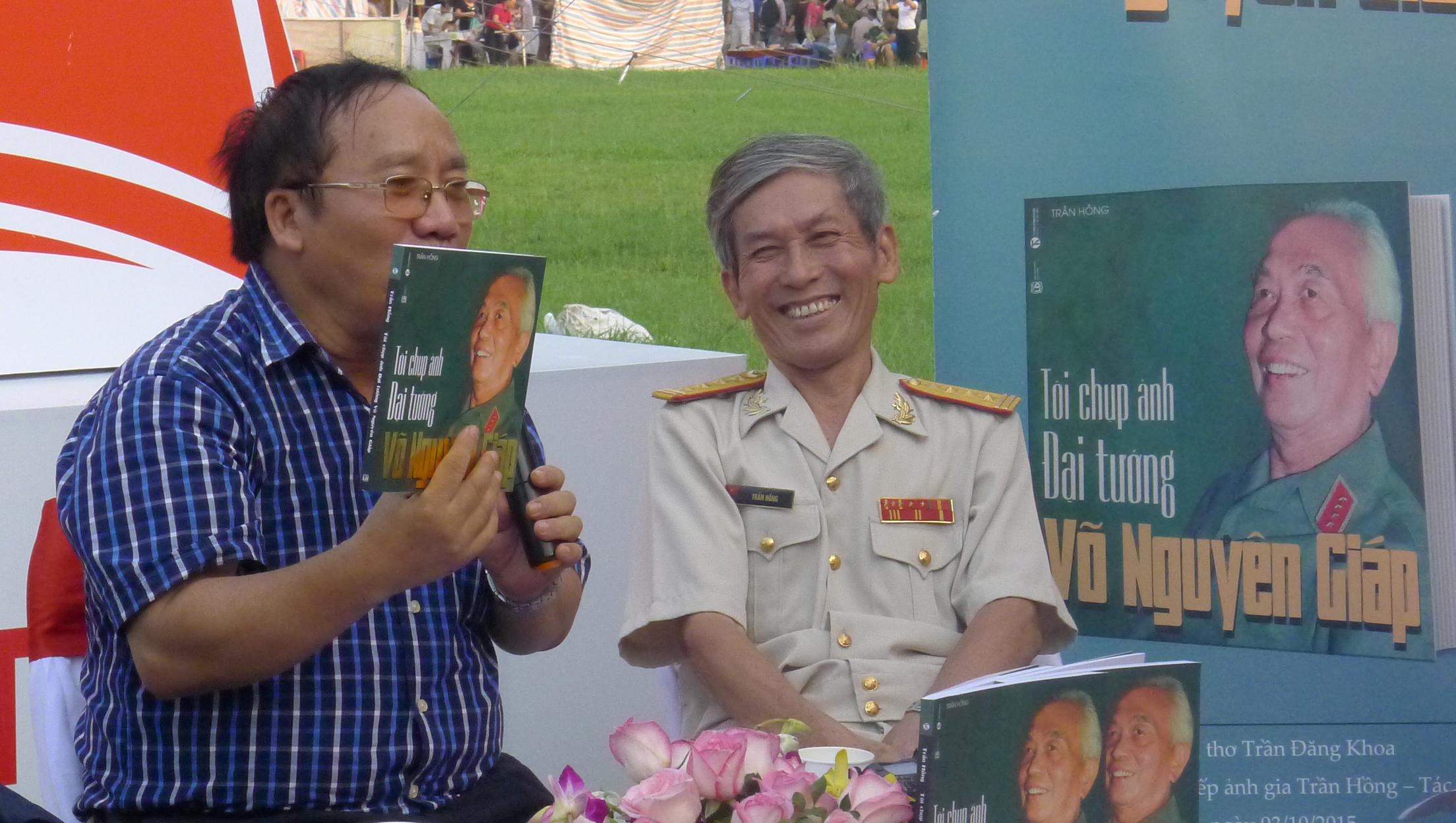 Le photographe Tran Hong (à droite) et le poète Tran Dang Khoa, vice-président permanent de l’Association des écrivains vietnamiens lors de la publication du livre photo intitulé « J’ai photographié le général Vo Nguyen Giap » |