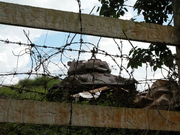 ![]() L'entrée du poste est encore gardée par le tank Sherman "Bazeille", ainsi nommé en souvenir d'un combat héroïque de l'infanterie de marine en 1870 près de Sedan. Source : http://www.balades.free.fr/Vietnam/eliane2.htm