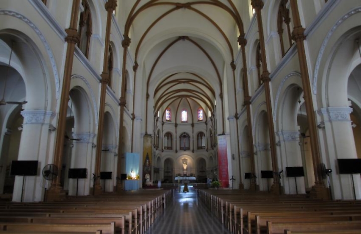 Située au numéro 1 de la place de la Commune de Paris, de couleur rose orangée, la cathédrale Notre Dame de Ho Chi Minh-ville ne passe pas inaperçue. Après la conquête de Saigon (ancien nom de Ho Chi Minh-ville), les colons français ont voulu construire leur propre église. Sa construction s’est étendue de 1877 à 1880 selon les plans de l’architecte Jules Bourard. Basée sur le modèle de Notre Dame de Paris mais plus petite, elle est empreinte de style roman et gothique. L'édifice est considéré comme le plus bel ouvrage réalisé pendant la colonie française. Nguyen Huu Thai, un architecte spécialisé dans les bâtiments coloniaux à Ho Chi Minh-ville: