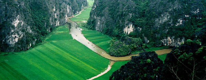 Van Long est surnommée « la baie sans vagues ». L’eau est tranquille telle un miroir géant qui reflète montagnes et nuages. Le site abrite un millier de grottes, chacune possède sa propre légende. Montrant une falaise abrupte, Do Thi Theu qui exerce la profession de rameuse précise :