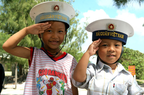 A l’ombrage d’un grand badamier, les enfants, futurs citoyens de l’île, s’amusent en chantant un air folklorique : « Au milieu de la mer, se trouvent les archipels de Truong Sa et de Hoang Sa, les chéris de la nation vietnamienne... »