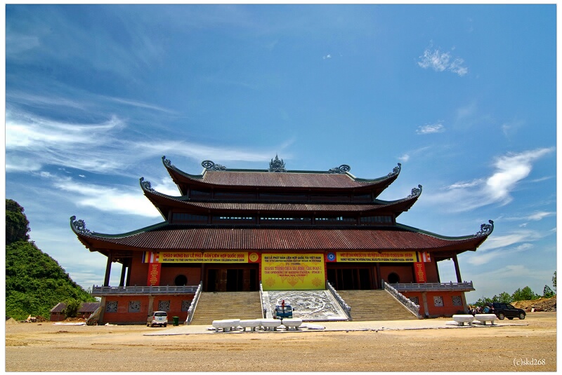 De l’ancienne pagode à la nouvelle, il faut longer une piste montagneuse d’un kilomètre. La nouvelle trône sur le versant de la colline Ba Dau, donnant sur le lac Dam Thi et la rivière Hoang Long, une position idéale selon la théorie millénaire du feng shui. 500 statues d’arhats sont installées sur les côtés des deux couloirs amenant le touriste depuis le portail principal jusqu’au sanctuaire des bouddhas du passé, du présent et du futur. Ces deux couloirs qui se rencontrent devant l’entrée du sanctuaire mesurent chacun 1700m, symbolisant l’acheminement vers le bouddhisme des arhats. Il s’agit du chemin d’arhats le plus long de toute l’Asie. Do Ngoc Anh :
