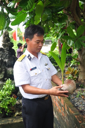 Ici, les cocotiers sont souvent cultivés pendant 2 périodes: au printemps et chaque fois qu’un groupe de soldats quitte l’île pour retrouver le continent. Chacun tient à planter un cocotier en guise de souvenir. Nguyen Van Tam, commissaire politique du groupe 1, fait savoir: « J’ai été affecté sur l’île 2 fois et j’ai planté 6 cocotiers. Les soins prennent beaucoup de temps même si l’arbre ne nécessite pas beaucoup d’arrosage. Quand les plantes sont grandes, on doit éliminer les feuilles mortes et placer sur la cime du cocotier un petit paquet de sel pour lui permettre de donner plus de fruits et d’éviter les maladies ».