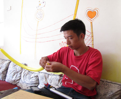 Hong Son est entrain de modeler un ballon jaune. Au bout de 4 minutes, on voit apparaître un chat auquel rien ne manque, pas même les griffes ou les oreilles. Seuls les yeux et les moustaches sont dessinés au feutre. La panthère rose, un chat hello kitty, un bonhomme de neige... on peut tout faire en airigami ! « Airigami », donc ! Ce terme, japonisant sans doute par référence à l’origami, pourrait se traduire en français par « modeler un ballon ». Et les personnes qui pratiquent cet art s’appellent donc des « twisters » comme nous vous le disions en introduction. Qui sait ? Les membres de l’académie française parviendront peut-être à trouver un nom bien gaulois pour désigner cet art et ses praticiens, mais en attendant, il faudra bien se contenter de ce sabir anglo-nippon ! En tout cas, Hong Son, pour en revenir à lui, est membre du club d’Airigami de Hanoi.