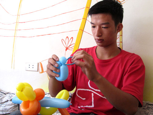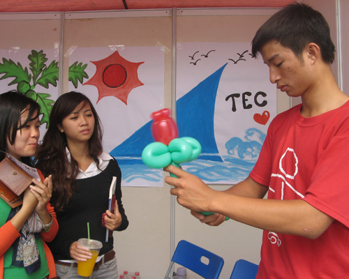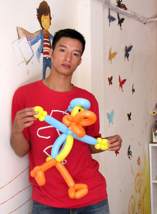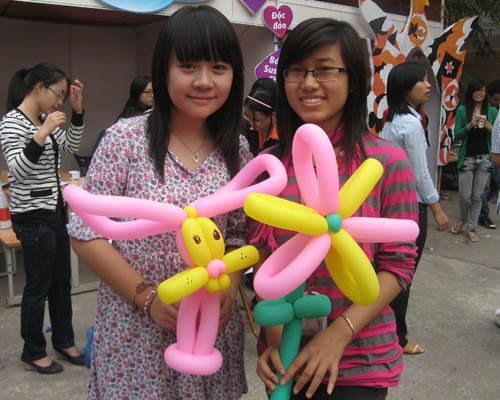Les techniques d'utilisation des ballons sont très diverses. L'assemblage de plusieurs ballons modelés peut bien sûr permettre de créer des figures. Dans ce acs, les ballons peuvent être attachés ou torsadés. Souvent, ce sont des animaux qui sont représentés, mais parfois, on voit apparaître de véritables oeuvres d’art. Huyen Mi, lycéenne à Hanoi :