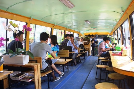 Ce café, comme son nom l’indique, est installé dans un ancien bus. A la place des 48 sièges, des petites chaises et tables pouvant accueillir une trentaine de clients et partout des slogans invitant les jeunes à protéger l’environnement et à utiliser les transports publics. Son propriétaire, Nguyên Manh Hung, nous raconte : « J’ai vécu au Japon pendant des années et j’avais remarqué que les jeunes Japonais utilisaient plus souvent les transports publics que nous. Alors comme je voulais créer une petite affaire, j’y ai repensé et j’ai décidé d’installer un petit café dans un ancien bus, près des universités pour attirer les jeunes. »