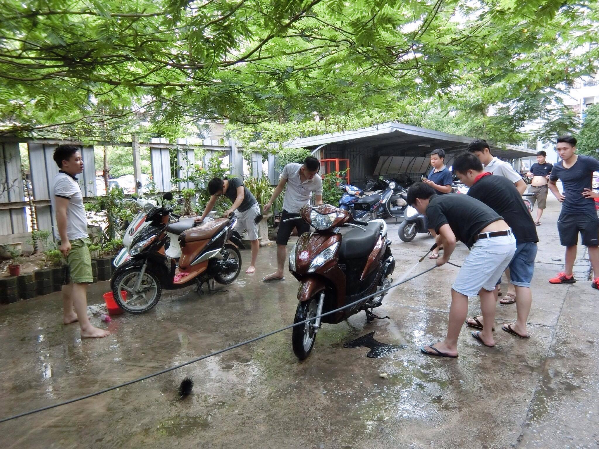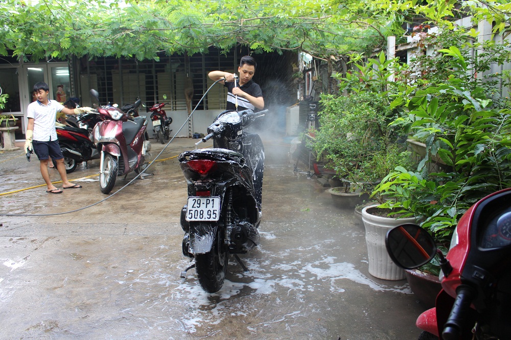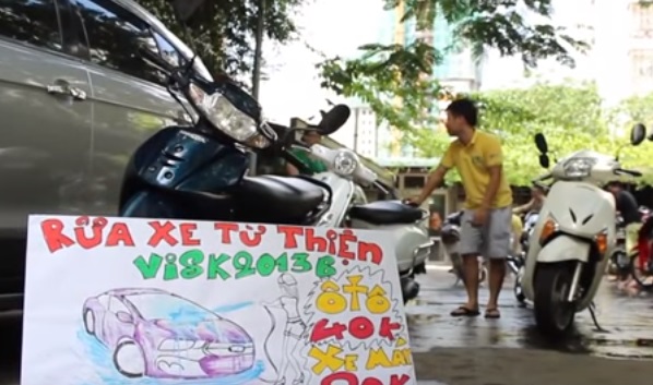 "Les étudiants doivent tout faire, tout d’abord acheter les outils nécessaires: la pompe, le nettoyeur à haute-pression, les brosses, le tonneau et les seaux. Ils louent aussi l'endroit et font des panneaux de publicité avec des couleurs aguichantes. Certains jours, en heure de pointe, j'ai compté 70 scooters dans leur station de lavage. C'est impressionnant, n’est-ce pas?"