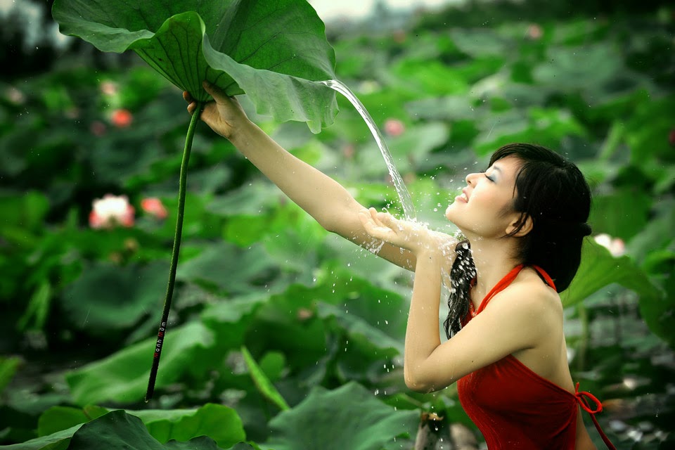 Vêtues de « Yem dao » - couvre-seins en soie blanche ou rose lumineux, un habit traditionnel -, elles portent des fleurs de lotus dans les bras, assises sur le petit pont en bambou et posent devant les photographes.