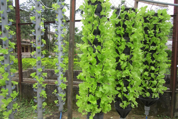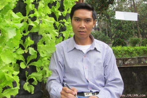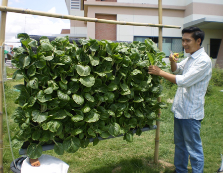 Les 5 m2 de balcon ou de terrace vous suffit de concevoir un mur végétal chez vous grâce à modèle inventé par Quy car des centaines de plantes d’agrément ou des légumes peuvent se developer bien sur ce truc. Quy nous explique dès maintenant comment faire pour concevoir un jardin vertical dans des grands immeubles avec sa création. Le principe paraît simple ! Nguyen Van Quy : "Vous devez avoir besoin d’un kit composé des pochettes, d’un cadre vertical et d’un système d’arrosage automatique. Comment ça fonctionne ? C’est simple! Tout d’abord, le kit doit être fixé sur un cadre vertical puis remplir les pochettes par le terreau. Il faut aussi un bac en bas pour contenir l'aliment (eau + engrais) qui sera remonté par une pompe d'aquarium dans des gouttes à gouttes le long du cadre et retombera dans le bac pour refaire indéfiniement ce cycle. Quant aux dosages en eau et en nourriture puis au débit des gouttes à gouttes, ça marche bien grâce à une horloge liée au bac. Le problème réside enfin dans le type de plantes à y mettre."