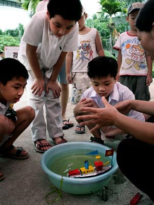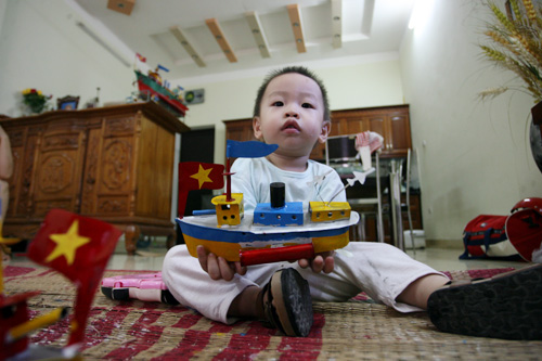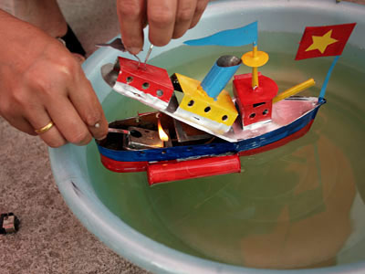 S'exclament avec joie Trung, un petit garçon de 4 ans et Huy, son petit frère. Aujourd’hui, ils ont reçu un cadeau bien spécial : un navire en tôle multicolore fonctionnant au kérosène qui tourne en rond dans le bassin. Son « moteur » lance des bruits continus et de la petite cheminée s’échappe de la fumée. Eh oui ! Ce jouet traditionnel, d’une longueur d’un empan, conserve toujours pour les petits vietnamiens un aspect merveilleux.
