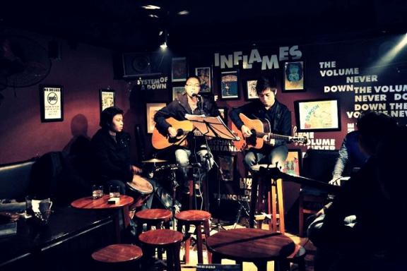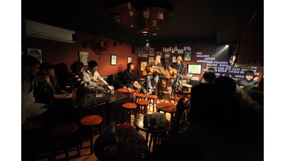 La salle, petite, il est vrai, est souvent archi-comble dès 8 heures du soir. Ce soir, c’est un chanteur accompagné d’une petite percussion et d’une guitare qui est sur scène. Rien de très spectaculaire, donc, mais la musique acoustique s’accommode plutôt bien de cet aspect intimiste : le son ne doit pas être trop dilué. Ici, l’usage est de ne pas fumer et de ne pas bavarder pour respecter le travail de l’artiste qui se produit sur scène. Ha Manh Tuan appartient au groupe Z. Il donne aussi des cours de formation de guitare acoustique pour les amateurs. Il confie :