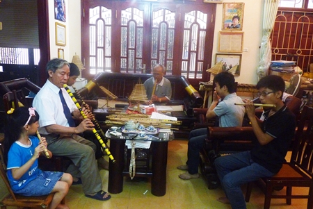 Très vite, Le Thai Son est devenu l’un des ambassadeurs de la flûte vietnamienne. Depuis une bonne quarantaine d’années, il écume toutes les grandes scènes musicales, aussi bien au Vietnam qu’à l’étranger. Mais il ne s’est pas contenté d’être concertiste ! Il s’est aussi consacré à l’enseignement, dispensant son savoir dans de nombreux établissements de formation musicale du pays. Et il faut croire que le virus pédagogique est solidement ancré en lui puisque maintenant qu’il est à la retraite, il persévère dans cette voie, à la différence près qu’il exerce donc à domicile. Le Thai Son : « Je donne gratuitement des cours de flûte pour tout le monde, notamment pour les jeunes et les étudiants, car ils n’ont pas le sou ! Actuellement, il y a environ 20 étudiants qui me suivent, du niveau élémentaire jusqu’au niveau intermédiaire. Ils sont la relève artistique ! Après, ils pourront parfaire leur formation dans des établissements d’enseignement musical. Mon objectif, c’est d’attirer de plus en plus d’étudiants pour préserver et valoriser la musique traditionnelle du pays. Et pour y arriver, je crois qu’il faut tout d’abord ouvrir des cours gratuits comme celui-là.
