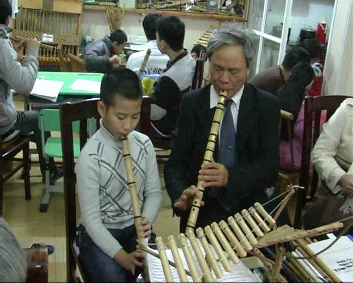 Derrière les grandes portes vertes, sept jeunes, âgés de 5 à 24 ans, entourent leur maître et jouent des mélodies folkloriques. Ngạc Văn Tảo, l’un d’entre eux : « Je viens de la campagne. Depuis mon enfance, j’aime jouer de la flûte. C’est pour ça que je suis les cours du professeur Son depuis maintenant un an. Un jour, je vais retourner dans mon village natal et jouer de la flûte, assis sur la branche d’un arbre, au milieu des champs. C’est mon rêve ! Ce serait très romantique, n’est-ce pas ? »