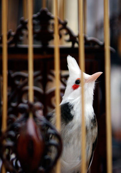 Une large variété d'appels et de jacassements, certains rauques, d’autres anxieux sont délivrés à partir de la véranda du café où suspendent une dizaine de cages alors que leurs propriétaires se rassemblent autour des petites tables à café en bois et échangent des expériences de bichonner, de soigner et d’entraîner leur volatile.