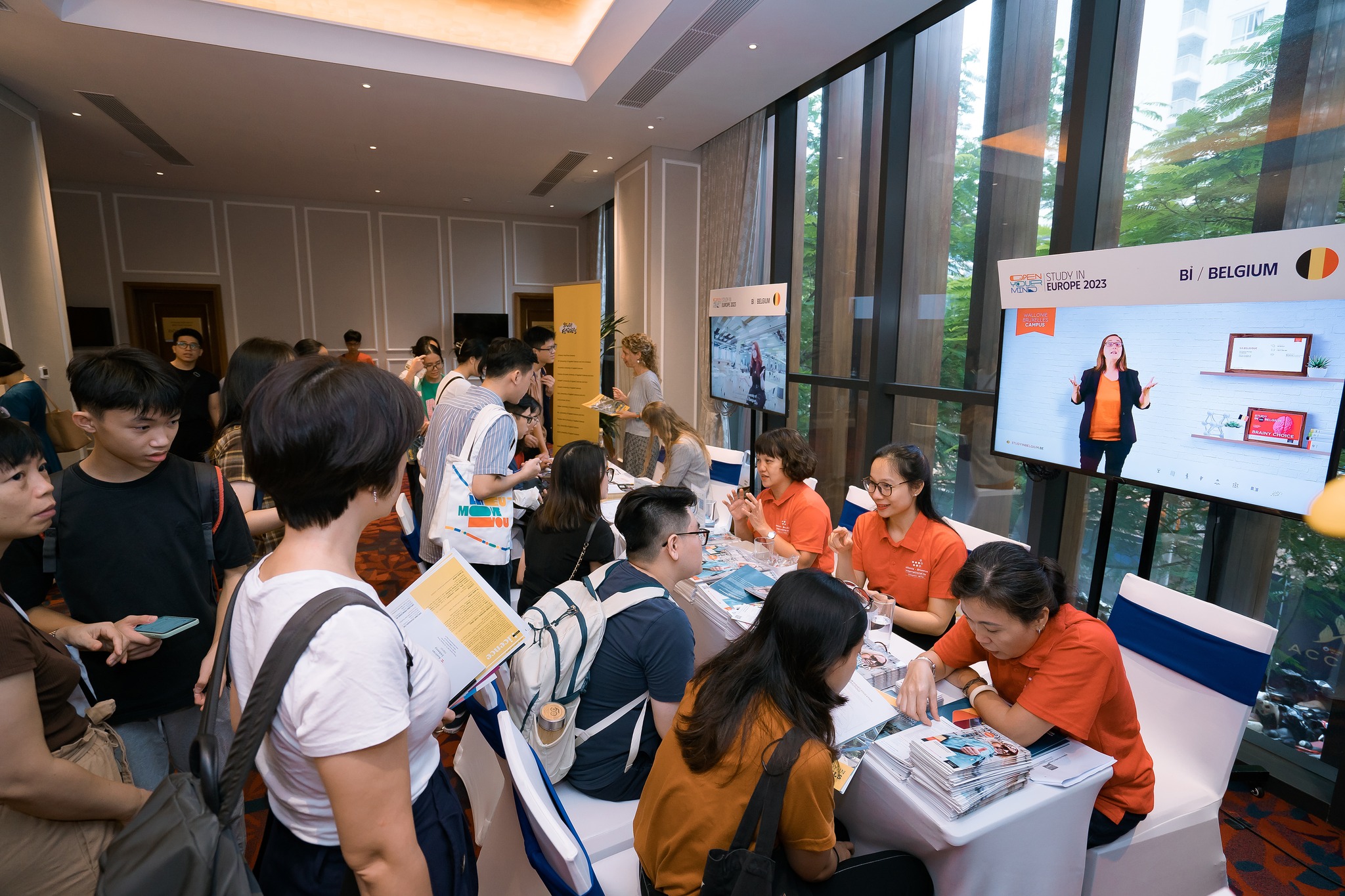 Les stands de la délégation de l’Union européenne au Vietnam et de l’Union des anciens étudiants d’Europe étaient aussi assaillis de jeunes, désireux de tout savoir sur les bourses Erasmus.