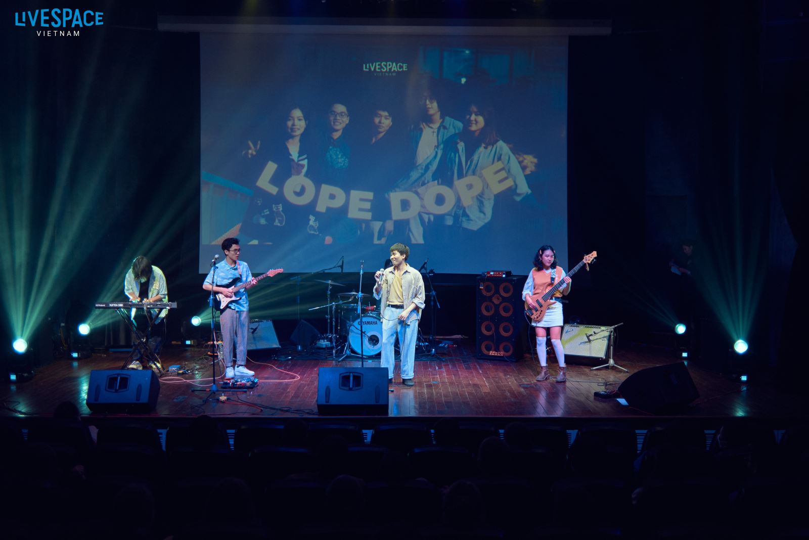 Le premier groupe de la soirée était Lope Dope, un groupe composé de cinq musiciens: le chanteur Hoàng Duong, les guitaristes Minh Quang et Phan, le batteur Tora et enfin le claviériste Khoa Trung. Créé fin 2020, le groupe propose une musique pop matinée d’un peu de blue et d'indie. Pour l'occasion, Lope Dope avait concocté quelques nouveautés, comme Vô Vi (Insipide, en français), Dêm Thành Phô, (La nuit en ville) ou encore Môt ngày dep troi, (Un beau jour): des chansons qui reflètent les problèmes que rencontrent la jeune génération, comme nous l’explique Hoàng Duong.