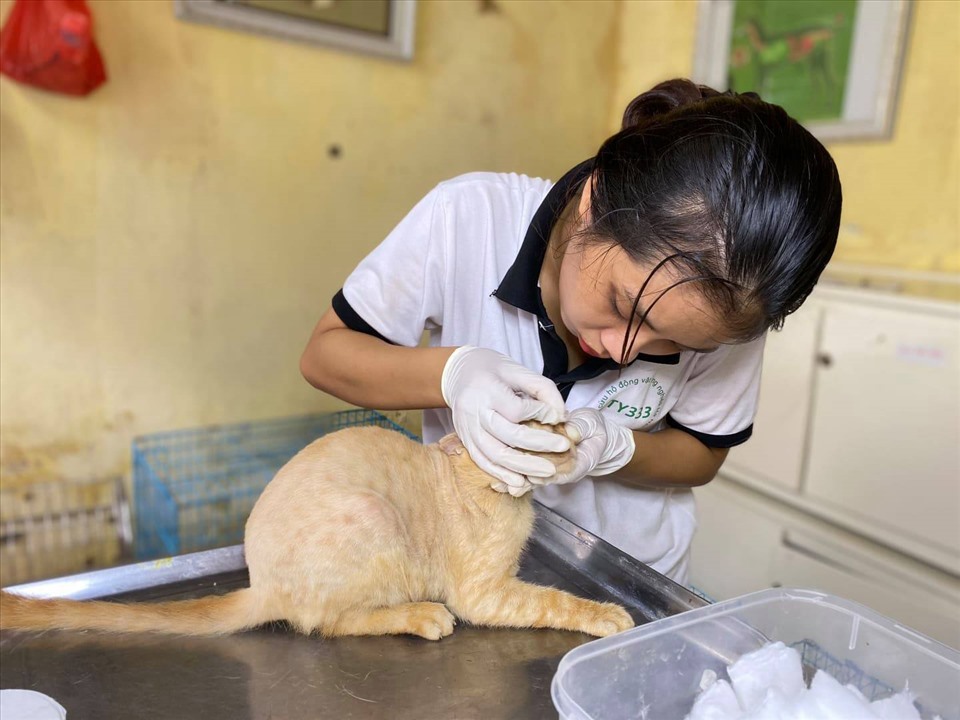 Nguyên Trung Hiêu, un autre bénévole, sort la litière d’un petit chat roux, tout maigre, placé dans une petite cage avec des croquettes et de l’eau propre. «C’est notre plus récent pensionnaire », nous raconte-t-il. « C’est une commerçante du vieux quartier qui l’a trouvé dans la rue Hàng Ma et qui nous a contactés. Aujourd’hui, il est en bonne santé... Ici, la journée commence par le nettoyage des cages. Il faut également nourrir les animaux. Viennent ensuite des traitements médicaux. Il faut désinfecter les blessures ou donner des médicaments selon les besoins.»