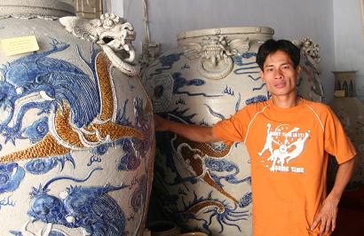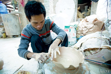 Les premiers jours, le travail était difficile pour le jeune handicapé. Mais l’effort, l’habileté manuelle et le goût des produits raffinés ont eu raison de tous les obstacles, et maintenant, Phạm Anh Đạo est un artisan-céramiste réputé. Son père Phạm Đức Huy, qui était lui-même céramiste, lui a toujours enseigné que le travail artisanal requerrait plusieurs qualités : une bonne santé, de la patience, de l’habilété manuelle, mais surtout de la passion. Il lui a également fait comprendre que les plus beaux objets étaient avant tout le fruit d’une réelle ferveur créatrice. Et c’est ainsi que Phạm Anh Đạo a fait son chemin, et que maintenant, il force l’admiration de son céramiste chevronné de père. Phạm Đức Huy : « Dès son enfance, il a compris qu’il fallait étudier et travailler dur. C’était un passionné. Même s’il avait passé toute la journée dehors, il pouvait rester dans l’atelier jusqu’à minuit. Personnellement, je suis fier de mon fils. Premièrement, il a su choisir une bonne voie, malgré son handicap. Et puis deuxièmement, il continue à préserver la tradition ancestrale de notre village, en nous faisant comprendre que l’efficacité économique n’est pas une fin en soi. »