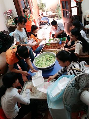 Sous la direction de Thu Dao, les jeunes bénévoles se divisent en petits groupes. Les uns pêlent les tomates, les autres lavent les choux… En un clin d’oeil, tout est prêt pour cuisiner. Tra My, une bénévole: