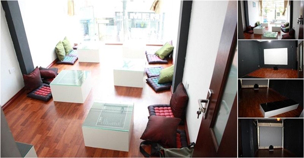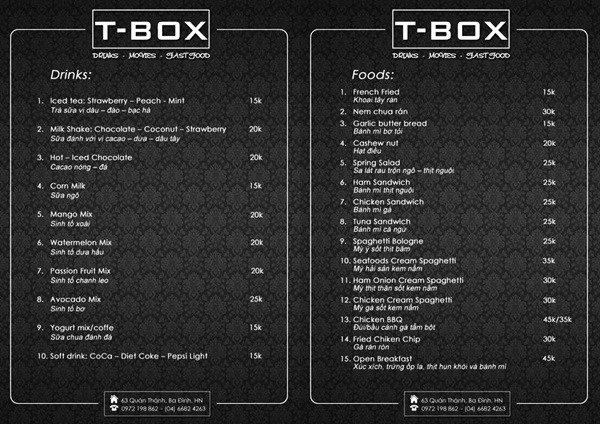 Chaque salle de 30m2 avec les 3 murs décorés en gris, le reste en blanc, est équivaut un écran de 120 à 150 inch pour la protection des films. Au milieu c’est une table avec des petits matelas comme le type japonais. Quand la lampe qui s’éteint, les scènes assez nettes sont animées sur le mur blanc. Les sonores vivantes viennent des mégaphones 5.1. Tout cela peut satisfaire le besoin de loisir des visiteurs. Selon Nguyen Manh Tuan, jeune patron de T-Box, la plupart des films non seulement vietnamiens mais aussi étrangers a succès se sont mis a jour régulièrement. Il existe 2 types de film pour choisir : film HD et film 3D. En particulier, les clients peuvent créer les vidéos pour y projeter comme un cadeau pour les amis. En plus, à citer un grand nombre du type des bonnes boissons mais bonne marchée, que sont les jus, les cocktails, ainsi que les fast-foods : "J’ai pas mal d’amis étrangers dont les coréens. En consultant les modèles prédécesseurs et les idées des amis, j’ai crée mon resto-CinemaT-Box qui s’orient vers 2 objectifs suivants. En premier lieu, T-Box est vraiment lieu pour ceux qui aiment regarder les films comme son souhait, y compris une espace privée. En second lieu, J’ai eu la chance de travailler comme cuisinier d’un restaurant européen. Je voudrais que les visiteurs puissent avoir l’occasion de goûter les fast-foods et les boissons de l’origine étrangère mais le prix vietnamien. Nous pouvons accueillir les groupes de 2 à 25 personnes pour les occasions comme anniversaire, la valentine."