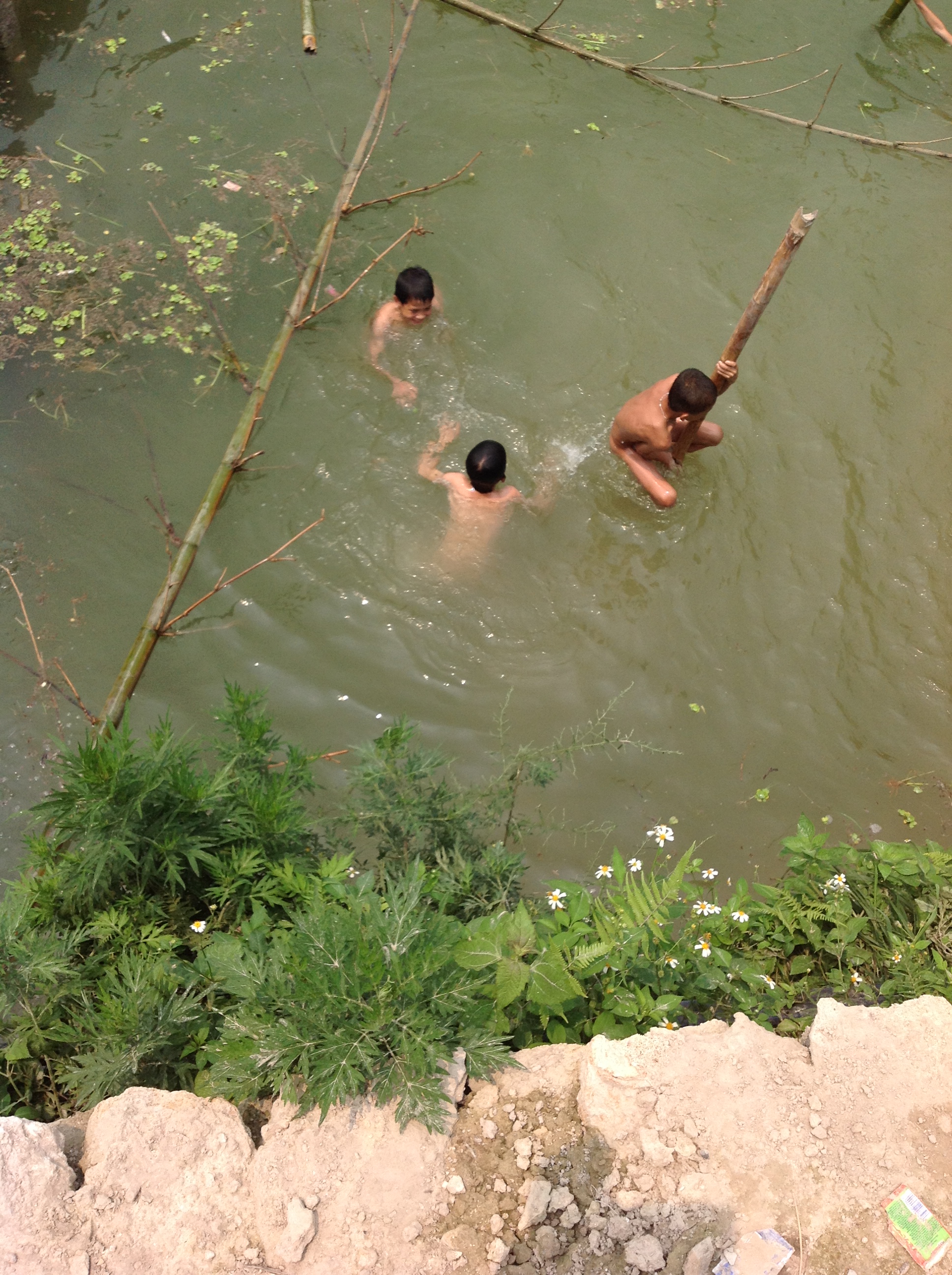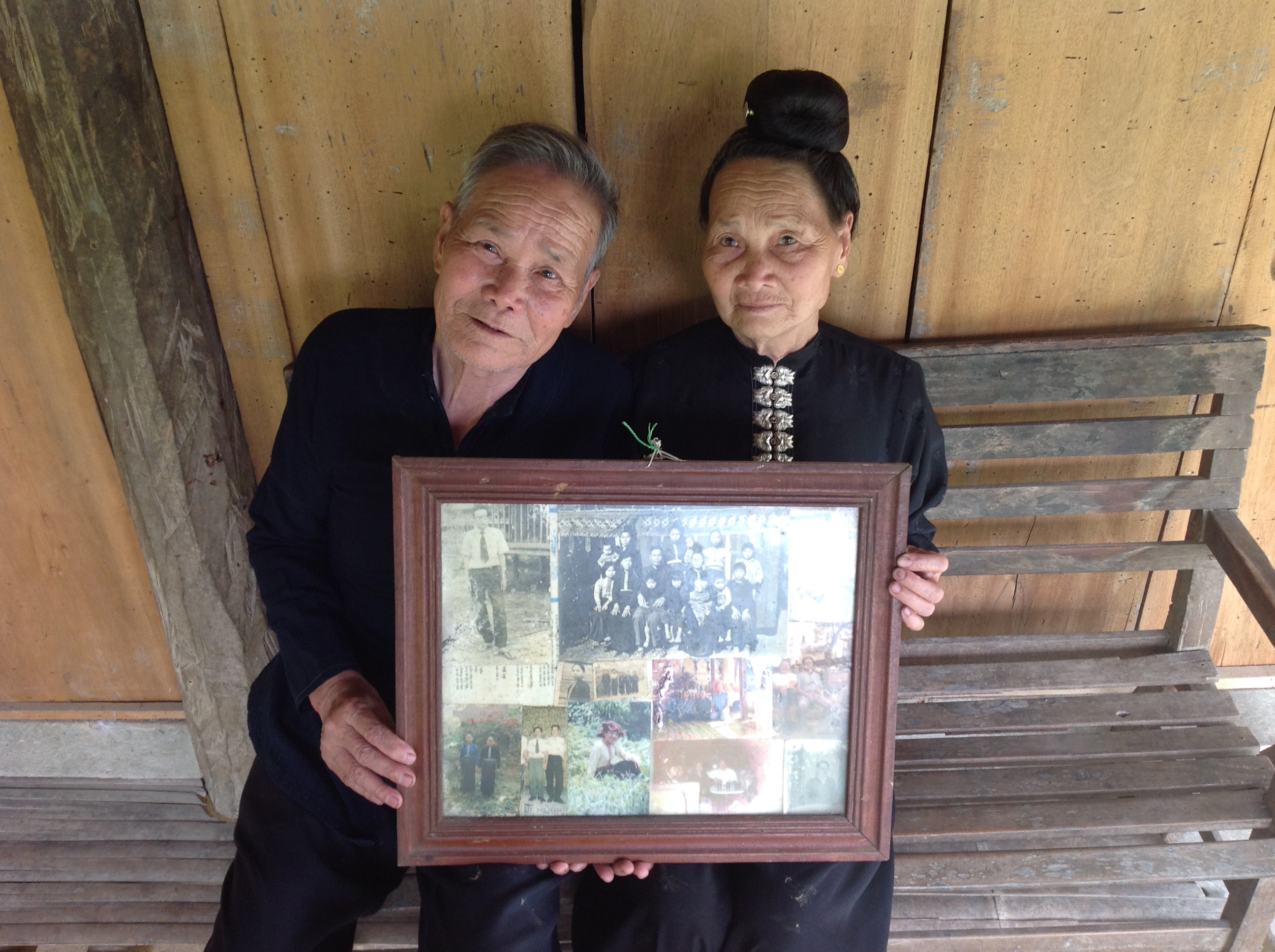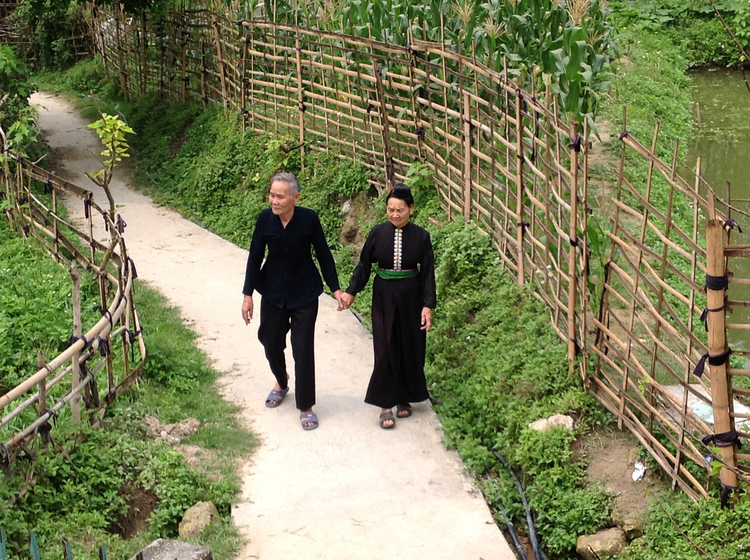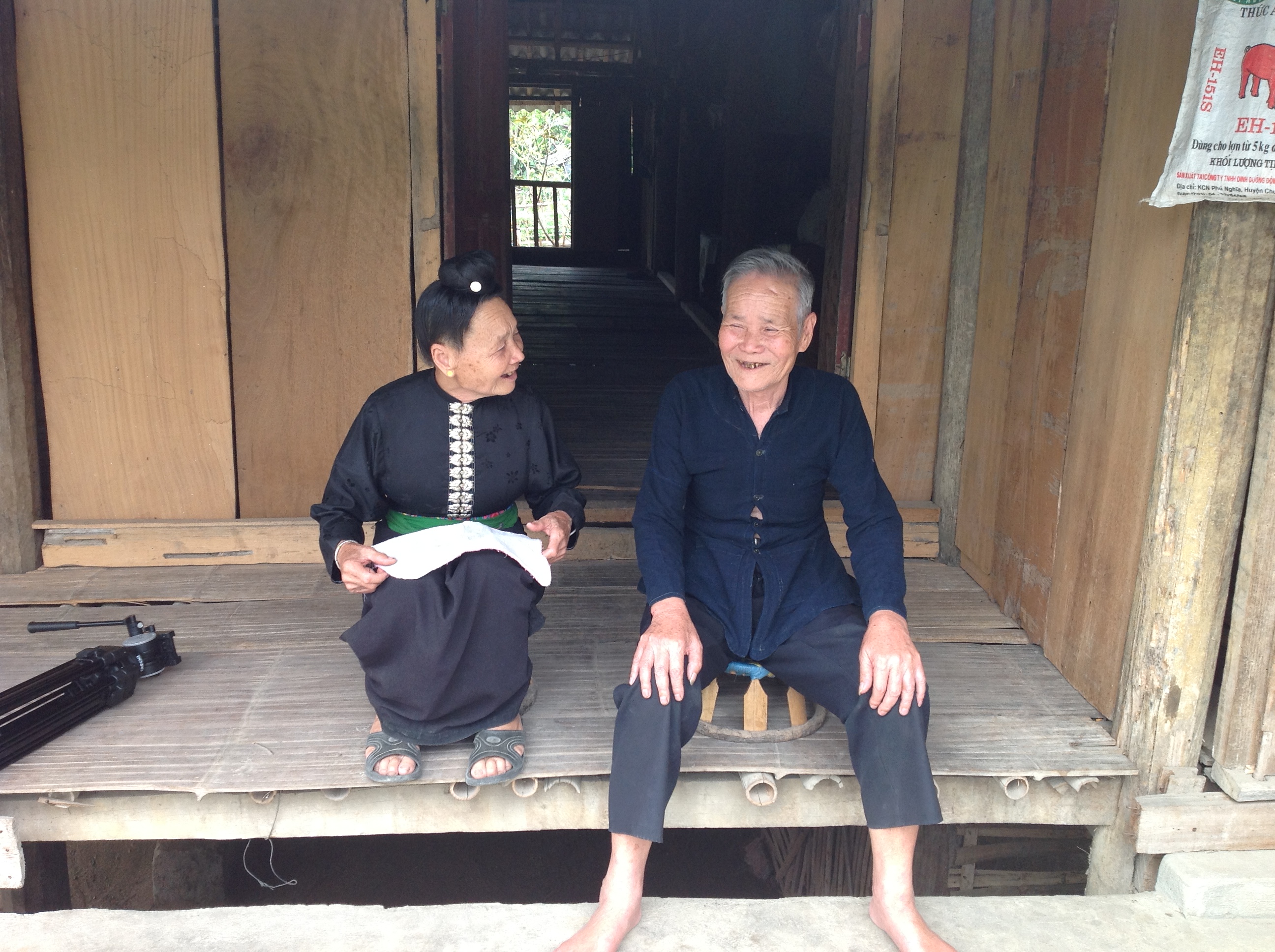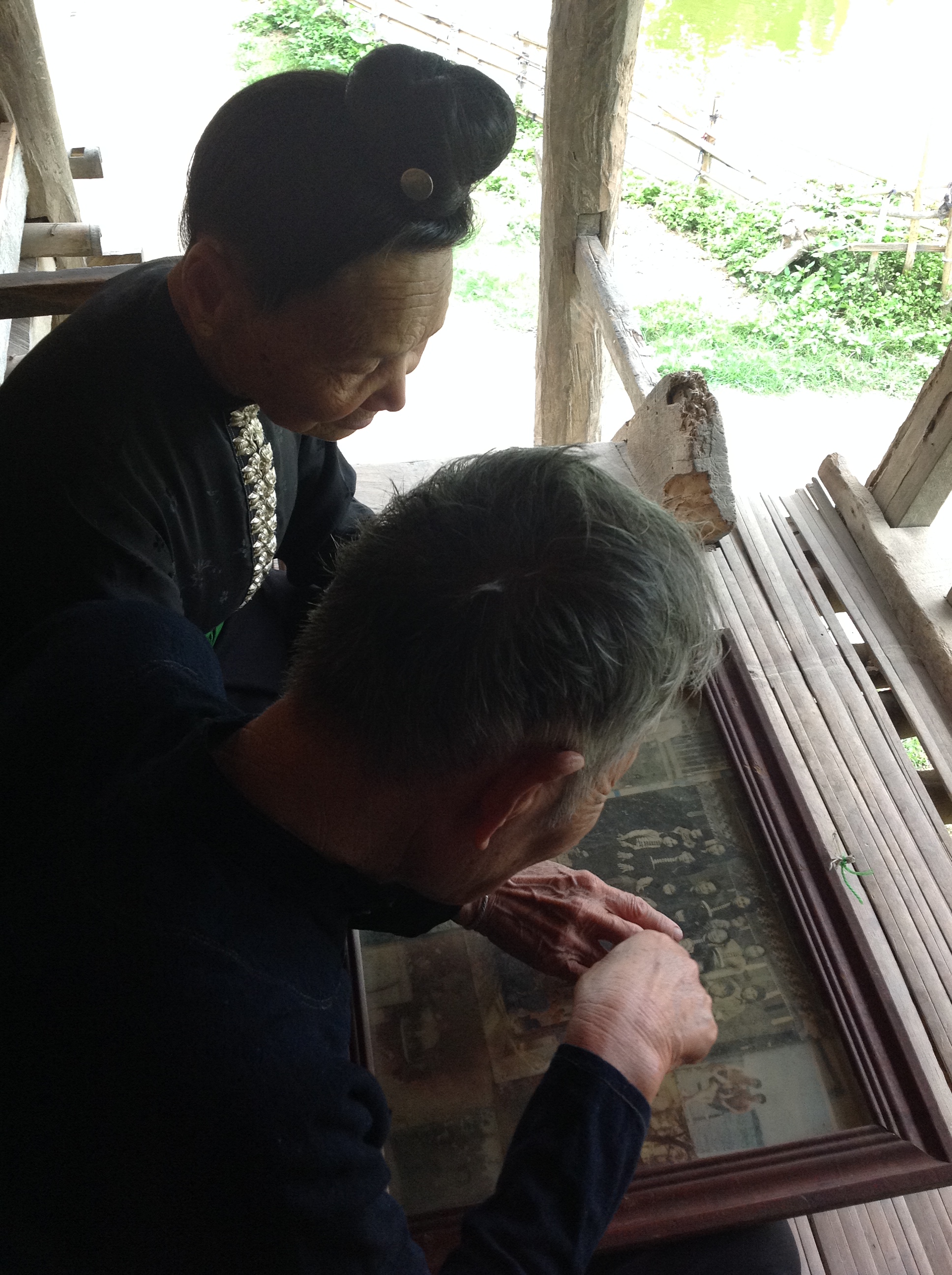 Je suis maintenant sous la véranda de la maison de Lo Thi Khuyn et Lo Van Tun. Lo Thi Khuyn, aujourd’hui octogénaire, porte la robe noire traditionnelle des femmes Thaï. Elle est en train de démêler les cheveux de sa petite-fille en lui recommandant de ne pas sauter et nager dans le petit étang devant la maison comme le font ses frères.