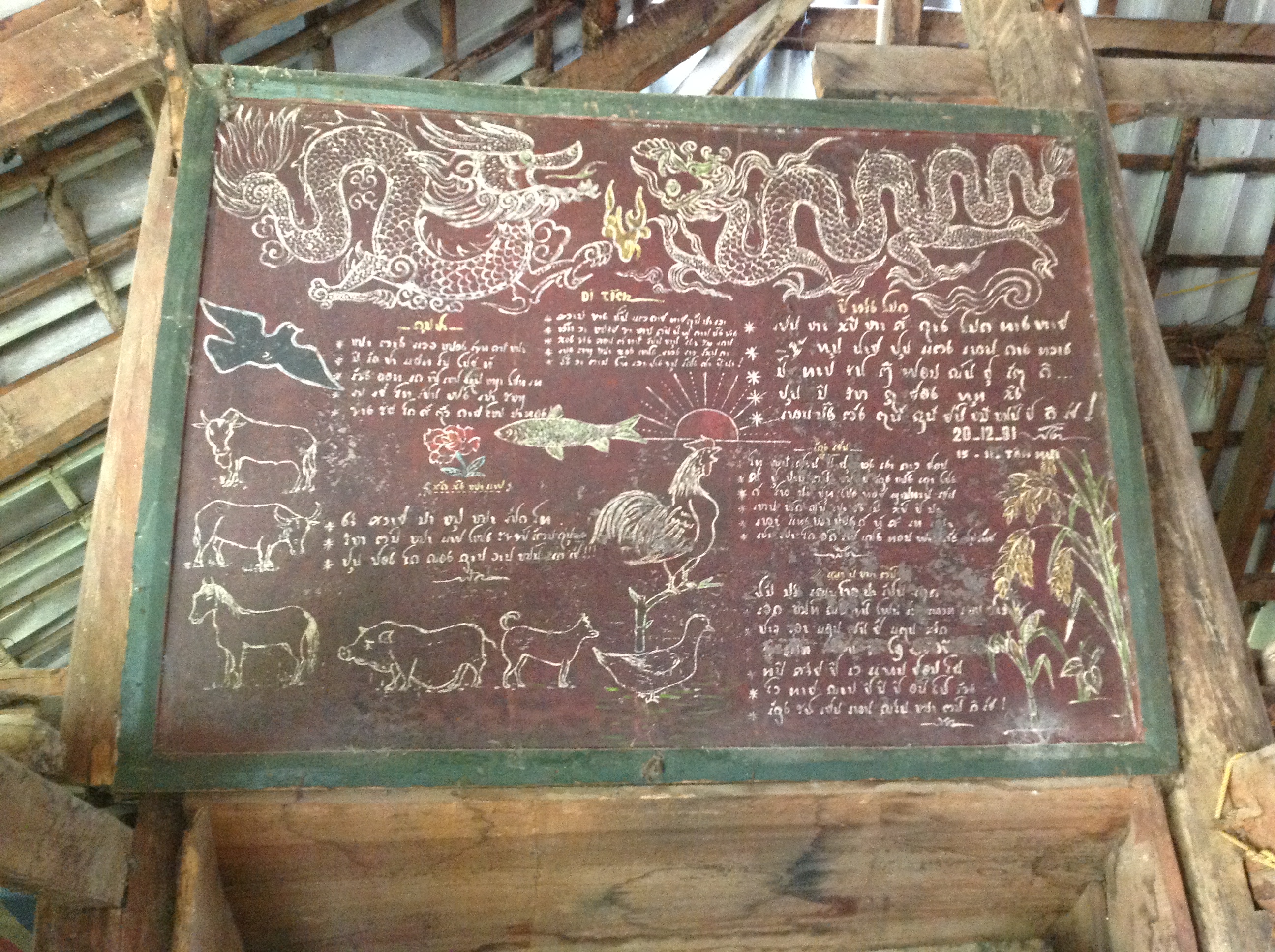 Sur le mur, à gauche, un panneau rectangulaire sur lequel est inscrit un poème en langue Thaï, et aux quatre coins un coq, un cochon, un bœuf et un buffle, qui sont des animaux domestiques indispensables.