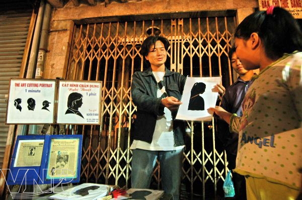 Indifférent à la foule qui l'entoure, Tô Hoàn reste parfaitement concentré sur son travail. Des ciseaux dans la main droite, une feuille de papier noir dans la main gauche, il fixe intensément son modèle, une jeune fille qui pose de profil, à 1m50 de distance. En moins d’une minute, devant les yeux ébahis des nombreux curieux qui se pressent tout autour, apparaît un profil à la ressemblance troublante. Des chuchotements d’admiration s’élèvent de la foule bigarrée. Quant à Thu Ngoc, la jeune fille en question, elle hérite d’un portrait aussi original qu’inattendu.