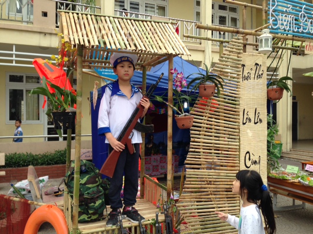 En face de ce stand, un autre, baptisé « Nos îles et notre mer », de la classe 3A4, dont Ngọc Dung est l’enseignante responsable : « Cette année, les élèves ont chanté « Aux îles lointaines » et du coup, c’est devenu le thème de notre stand. Pour la déco, nous avons disposé sur la porte deux panneaux illustrés avec des voiles de bateaux. A gauche de l’entrée, il y a aussi un belvédère sur lequel un élève en uniforme est en train de combattre pour défendre l’intégrité de la nation ! »