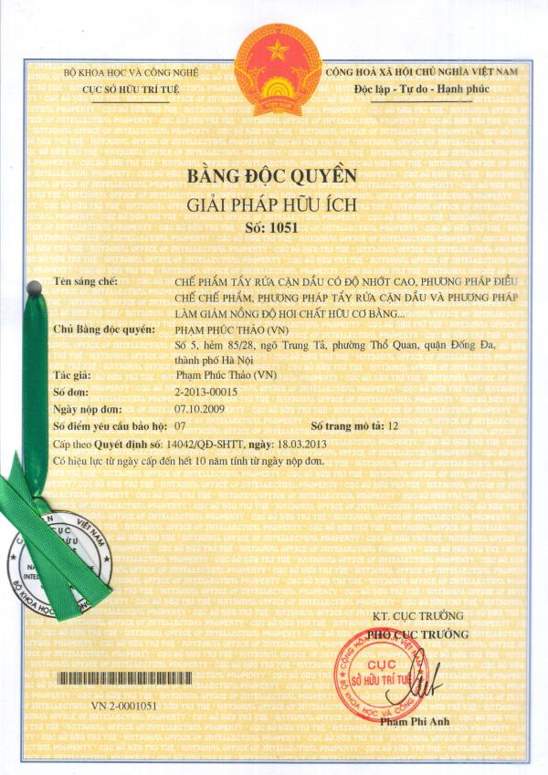 Lors de la manipulation des réservoirs de fioul et de gazole, Pham Phuc Thao avait constaté qu’une grande quantité des résidus restait collée aux réservoirs. Les ouvriers devaient alors entrer dans les citernes, utiliser des brosses et du pétrole lampant pour les nettoyer. Ce nettoyage outre de représenter une perte de temps considérable, et un coût de traitement onéreux, avait aussi des effets nocifs sur la santé des ouvriers. Thao a alors inventé un nettoyant chimique baptisé TCF 0507 à base d’huile végétale pour traiter les résidus de fioul. Grâce à ce produit, 90% des résidus ont pu être conservés pour être recyclés, ce qui a également permis de réduire le volume de déchets sur l’environnement. En utilisant ce produit, le Groupe a gagné 75% de temps dans le nettoyage qui était auparavant manuel, long et coûteux. Des milliards de dongs ont par ailleurs été économisés. Phạm Phúc Thảo :