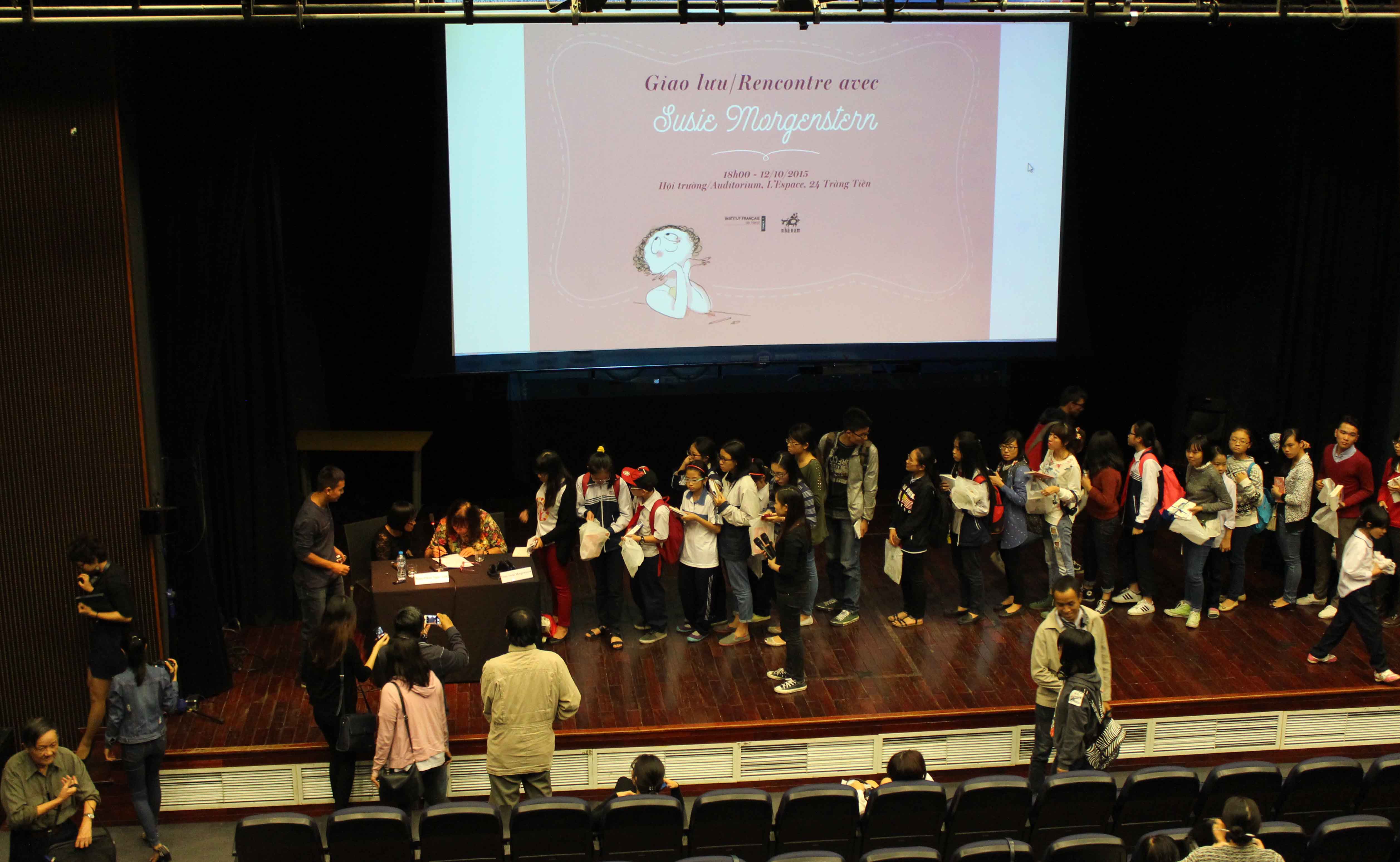 Un bel accent américain... C'est Susie Morgenstern, l'écrivaine aux lunettes roses en forme de coeur qui est en train de lire « Pas de bol! », l'un de ses albums cultes pour jeunesse lors d'une rencontre avec ses jeunes lecteurs vietnamiens à l'Auditorium de l'Espace, l'Institut français de Hanoi.