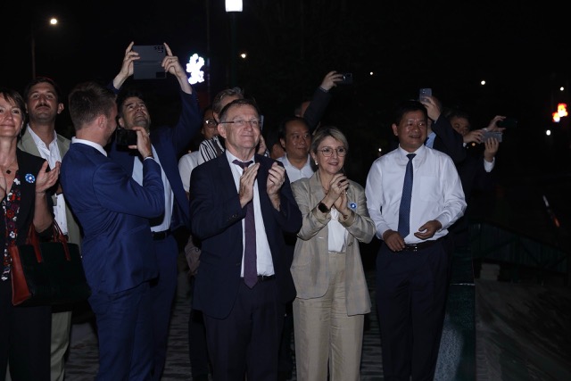 Le Pont Muong Thanh a été illuminé en présence du Directeur de l'AFD au Vietnam Hervé Conan, de la Secrétaire d'État chargée des Anciens combattants et de la Mémoire Patricia Mirallès et du Président du Comité populaire de la province de Diên Biên Lê Thành Dô. Photo: AFD |