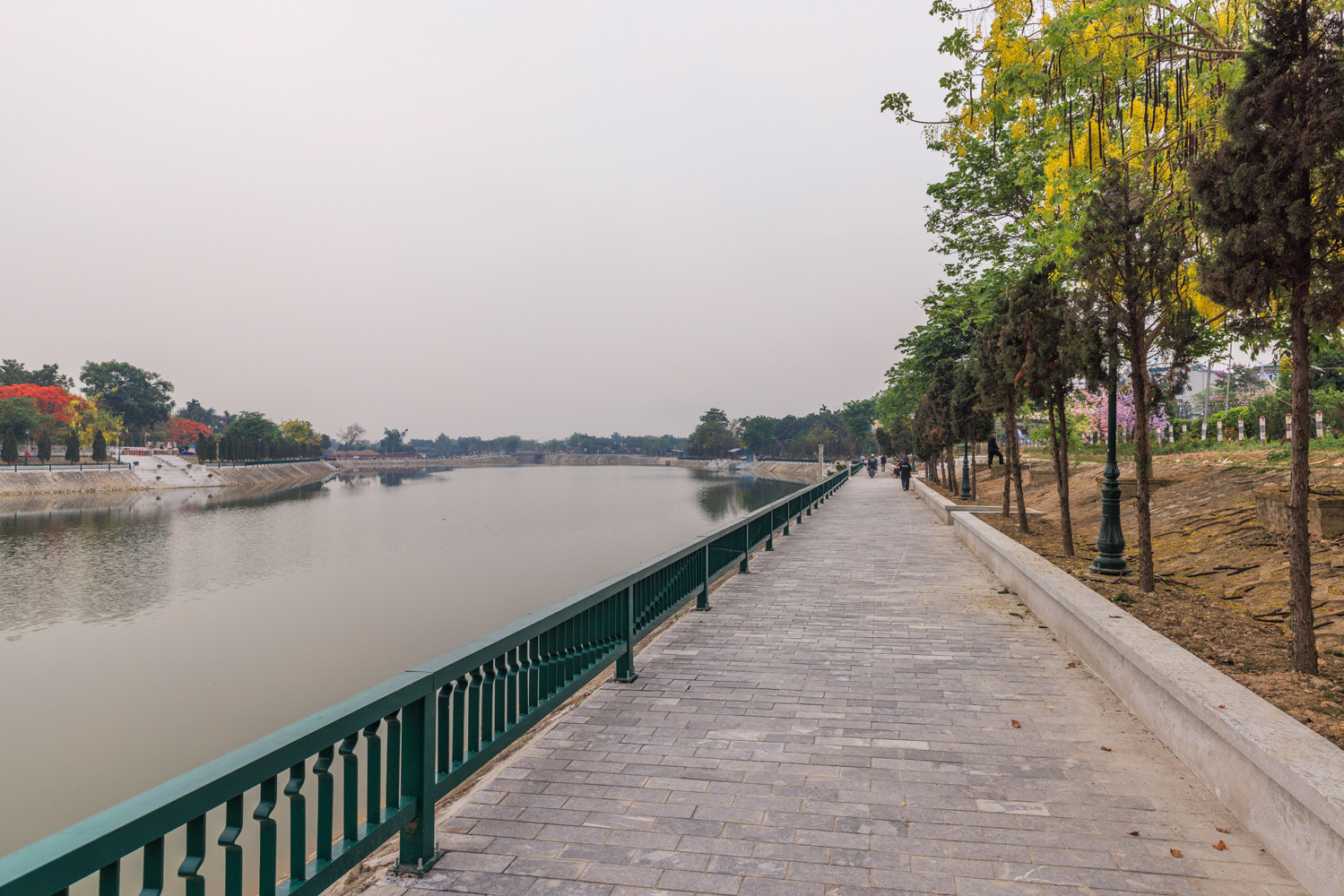 «Ces travaux concernent d'abord l'ensemble de la circulation, avec des aménagements piétonniers le long des berges, sachant qu'il y a eu un curage important du lit de la rivière avec un seuil qui est situé en aval du pont Muong Thanh, et la réalisation d'une étendue d'eau. C'est un petit lac à l'intérieur de la ville, qui change complètement l'apparence de cet environnement. L'aménagement piétonnier a été étendu puisqu'il y a eu une passerelle qui a été réalisée pour permettre d'aller d'un pont à l'autre et de vraiment pouvoir faire le tour de cette étendue d'eau. Il y a eu des systèmes d'observatoire qui ont été réalisés et également des escaliers le long des berges qui permettront aux populations et aux visiteurs de pouvoir observer l'ensemble de la zone et en particulier le pont Muong Thanh, de pouvoir l'observer depuis ces sites qui présentent réellement un changement total dans la dimension paysagère de cet espace», nous explique-t-il.