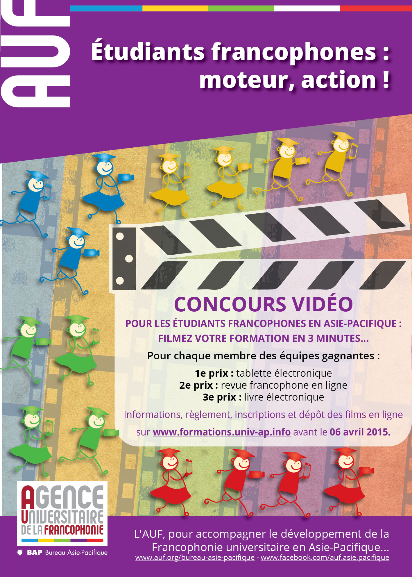 Un concours de vidéos pour les étudiants francophones de la région Asie-Pacifique : une grande première ! Ce concours concernait seulement les étudiants inscrits en 2014-2015 dans des formations francophones ou bilingues, de licence ou de master, ou dans les départements de français des universités de la région. Ils devraient former une équipe de trois à quatre personnes au maximum et tourner un mini-film de deux à trois minutes pour présenter leurs parcours universitaires francophones. Marion Alcaraz, responsable de projet "Numérique éducatif" de l’AUF :