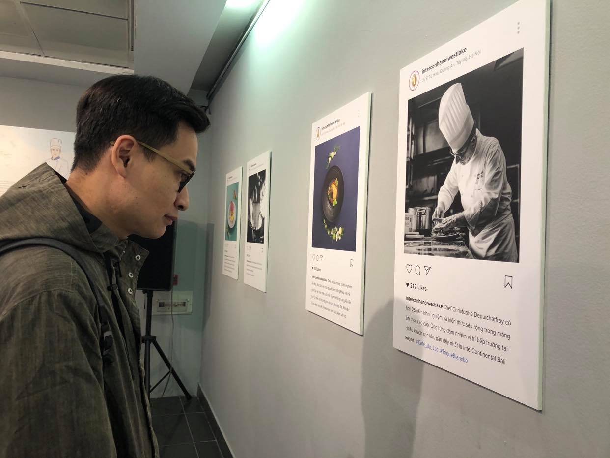 «C’est intéressant de fêter la gastronomie et de proposer de goûter les plats, mais avec les yeux!», nous dit-il. «On a confié pour mission à deux équipes de photographes d’aller faire le tour de douze restaurants à Hanoï et de photographier à la fois les chefs et leurs réalisations. Comme les résultats sont très beaux, nous avons également demandé à un artiste visuel français de travailler sur la réalité augmentée sur l’ensemble des photos. Aujourd’hui, une grande partie de la communication et des photos qu’on partage sont sur les réseaux sociaux. On a voulu faire un petit clin d’œil à cette tendance. Comme beaucoup de gens qui vont au restaurant aiment bien prendre une photo de ce qu’ils vont manger, notre scénographe Mai Nguyên Anh a décidé de présenter des photos comme si c’était une collection de clichés sur Instagram», a-t-il précisé.