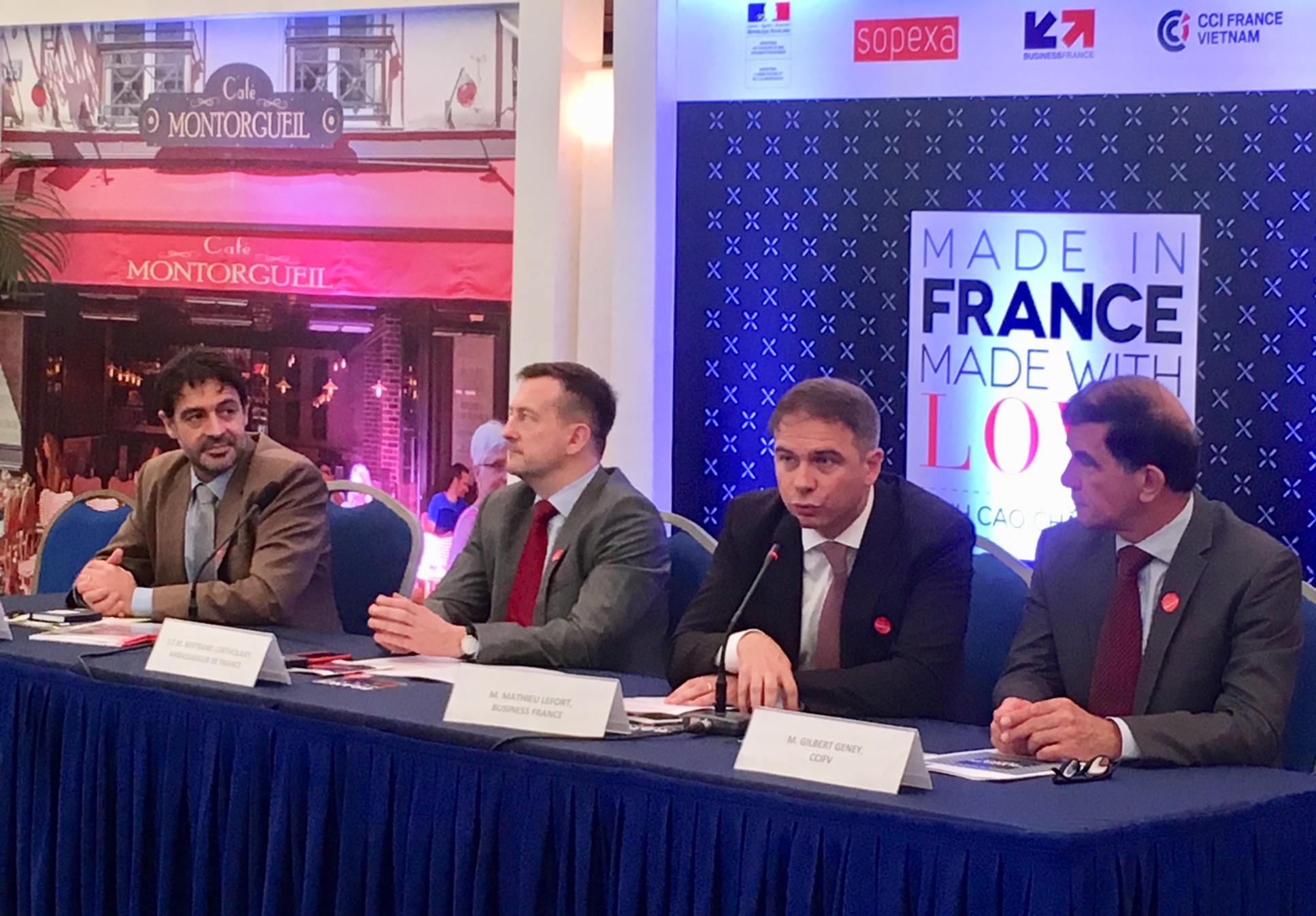 «Grâce au soutien de différents partenaires, placés sous l'autorité du ministère de l'Agriculture, nous avons pu réserver un espace de plus de 360 m2 pour assurer la promotion de l'offre française. Bien entendu ces interprofessions ne vont pas venir seules puisque ce sont près d'une trentaine d'entreprises membres de ces interprofessions qui vont faire le déplacement, soit au total près d'une centaine de délégués qui vont venir de France à Ho Chi Minh-ville», nous explique Matthieu Lefort, le directeur de Business France au Vietnam (2e à droite).