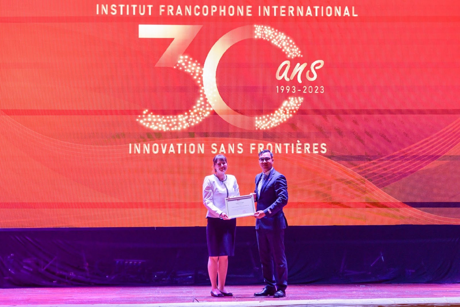 Catherine Dandonneau, directrice adjointe de l’administration de l’AUF pour la région Asie-Pacifique, a décerné à l’IFI le certificat «Pour sa contribution à la science francophone» mettant à l’honneur la contribution particulière de l’IFI à la préservation et à la valorisation des valeurs francophones en Asie-Pacifique et au Vietnam en particulier.