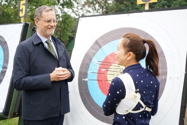 L'ambassadeur de France au Vietnam rencontre une athlète de tir à l'arc. Photo: Département des sports |