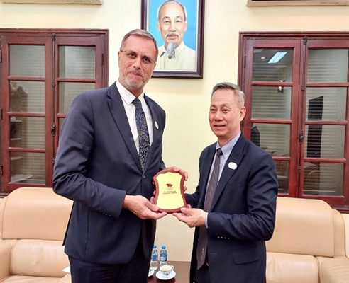 Le secrétaire général du Comité olympique du Vietnam Trân Van Manh accueille l'ambassadeur de France au Vietnam Olivier BROCHETPhoto: Département des Sports |