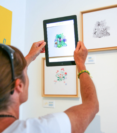 Lorsque l’on met son téléphone ou sa tablette face à chacune des œuvres, celles-ci s’animent en devenant vivantes et colorées. Les fleurs s’épanouissent, les buissons en noir et blanc sur papier se colorent, les châteaux sont encore plus splendides… Les œuvres se transforment avec des effets de 3D, combinant couleurs, mouvements et sons. Le spectateur, lui, est entraîné avec humour et poésie entre le craft et le digital, le papier et l’écran, le fixe et l’animé, le muet et le sonore!