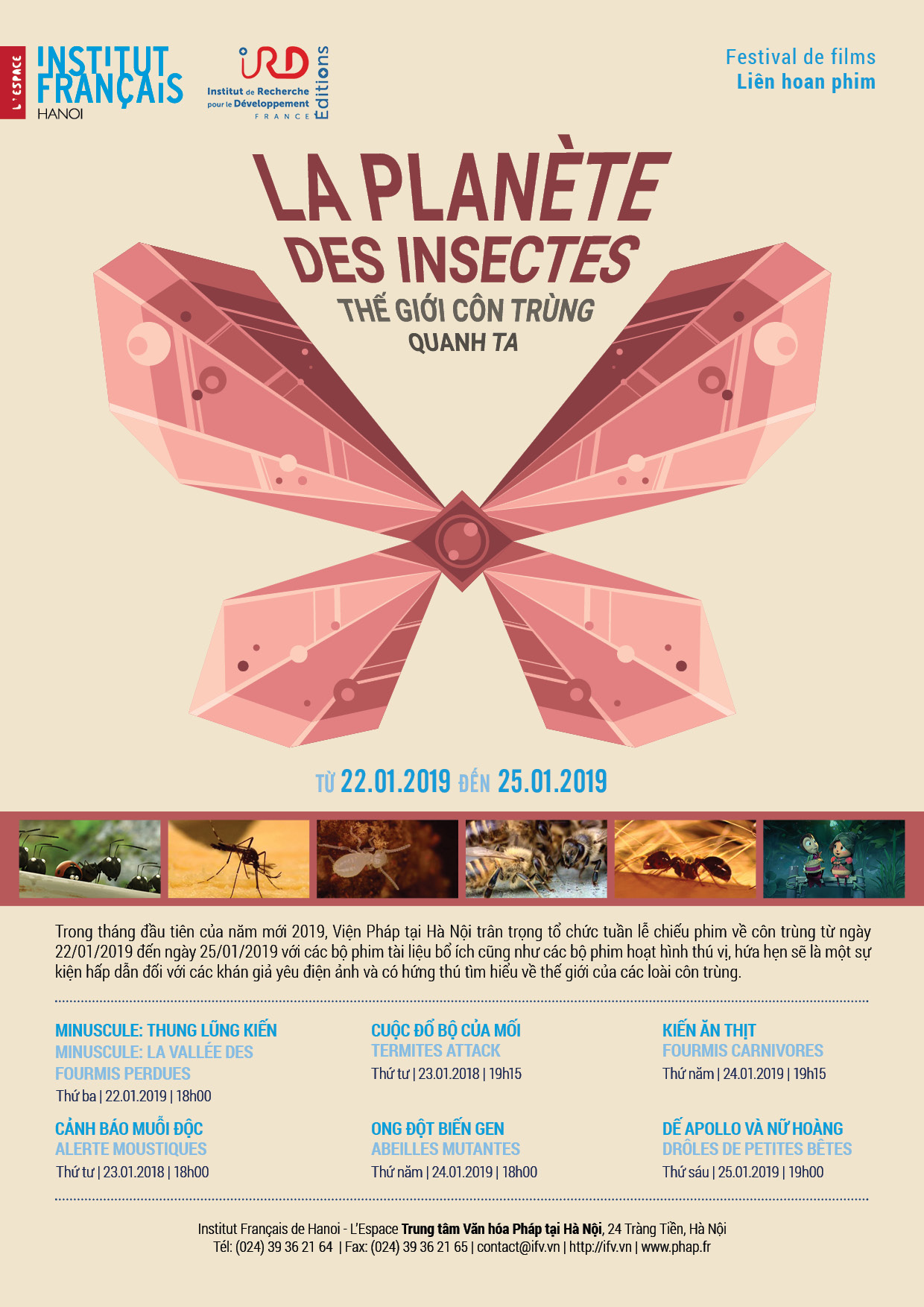 «Minuscule : la vallée des fourmis perdues», «Alerte moustiques», «Termites attack», «Abeilles mutantes», «Fourmis carnivores», «Drôles de petites bêtes»… Tout un programme!... Un programme de projections, en l’occurrence, prévues du 22 au 25 janvier à l’Auditorium de l’Institut français de Hanoi, au 24 rue Tràng Tiên.
